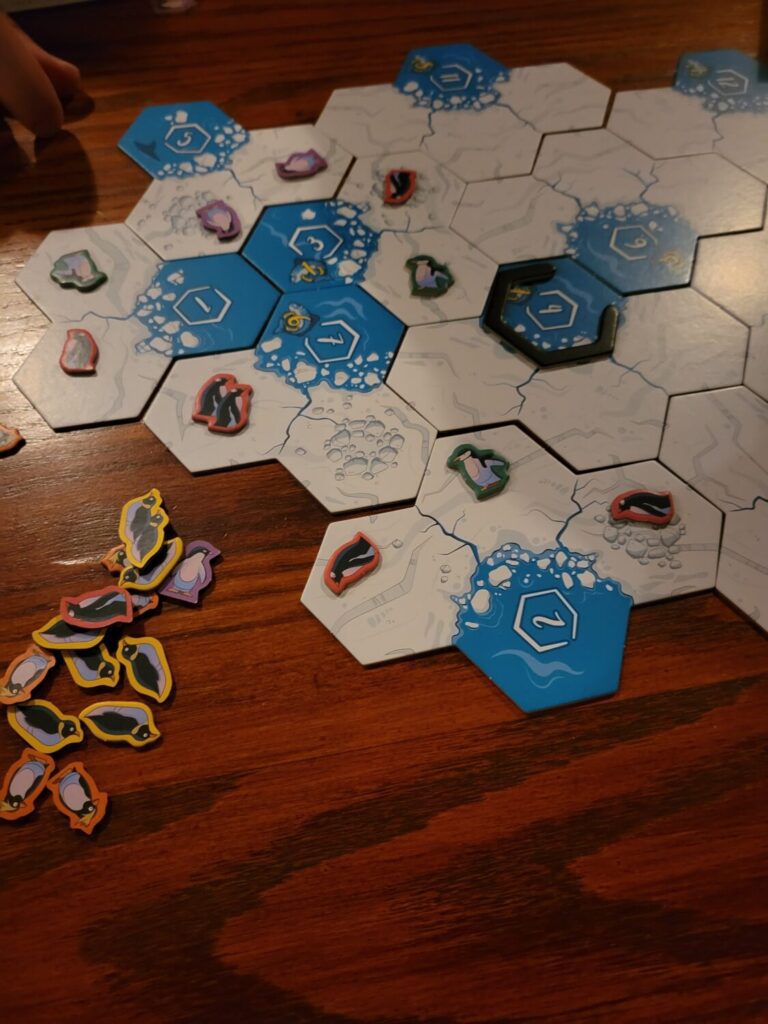 Then, for each contiguous group of water, players win points if there are fish in the water. One space might have a single 7 point fish, while another has two spaces, one with 5 and the other with 3 points. The player with the majority of penguins around the perimeter of the water wins the fish with the largest amount of points, with friendly ties. Second place gets the smaller amount of points if it exists, and so on.