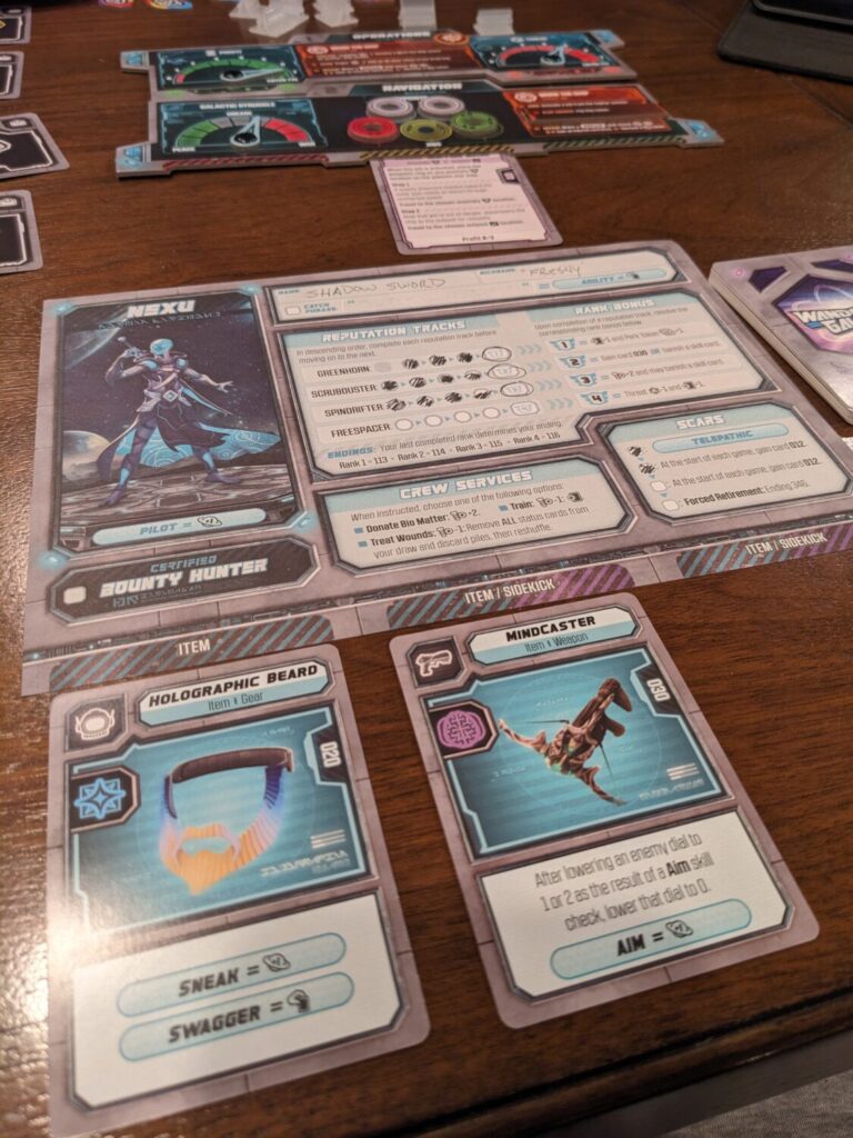 Items and sidekicks here are mainly used to offer more symbols that can be added to skill checks, so that’s fine. There’s still a lot to manage in terms of side boards, but with a larger group, that’s an issue that goes away. Also, the initiative tracking required in Freelancers is gone in Wandering Galaxy; one player has the first player token, and that moves often between actions and rounds, so everyone will get their chance to shine.