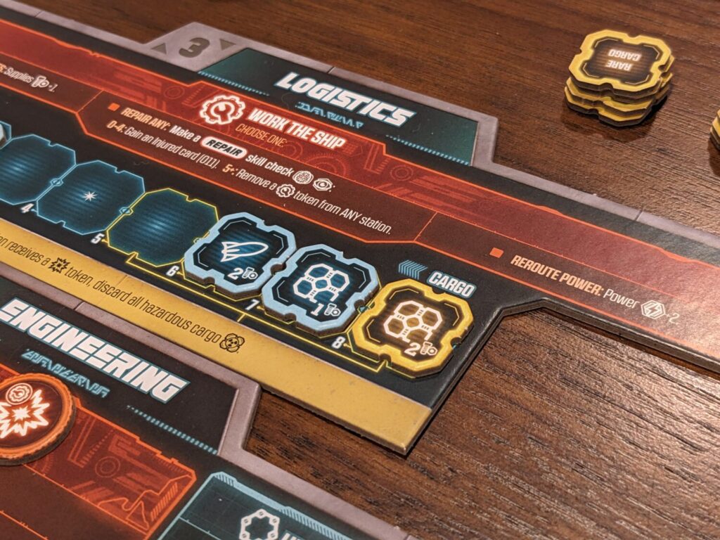 Solo was not a good idea. In solo play, you have to manage your own character plus two apprentice characters that act like normal players. You’ll also have to manage six ship station boards, a scenario book, the app, a galactic star map, a draw bag full of risk and damage tokens, a card catalog, and a skill card market of four cards. It was a comedy worth watching, as I tried to manage all of this by myself on a large table. The entire activity brought me shivers as I remembered how hard it was to manage games like The Elder Scrolls: Betrayal of the Second Era all by myself.