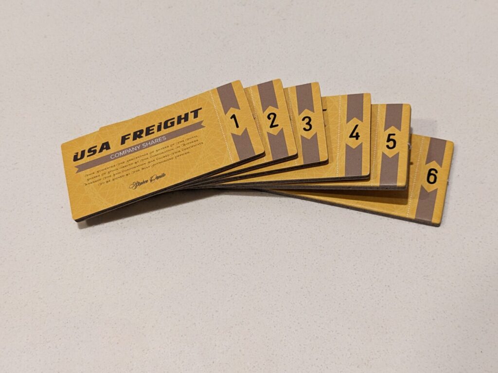 Some of the elements that don’t work for me now are tied to my current infatuation with traditional train games, particularly tied to stock. In Whistle Stop, shares are just shares, with values that don’t exist in the traditional sense. There are five shares in each company, and only the person who has the most shares will get a scoring bonus when the game ends.