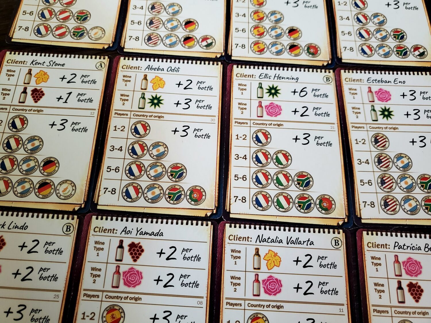 Obviously the other information on the cards matters. Players are also attempting in each game to satisfy the whims of customers, chasing scoring particulars related to the type of wine and the country of origin. These customer cards are face-up throughout the game so that everyone’s greatest desires lay bare for scrutiny and interference.