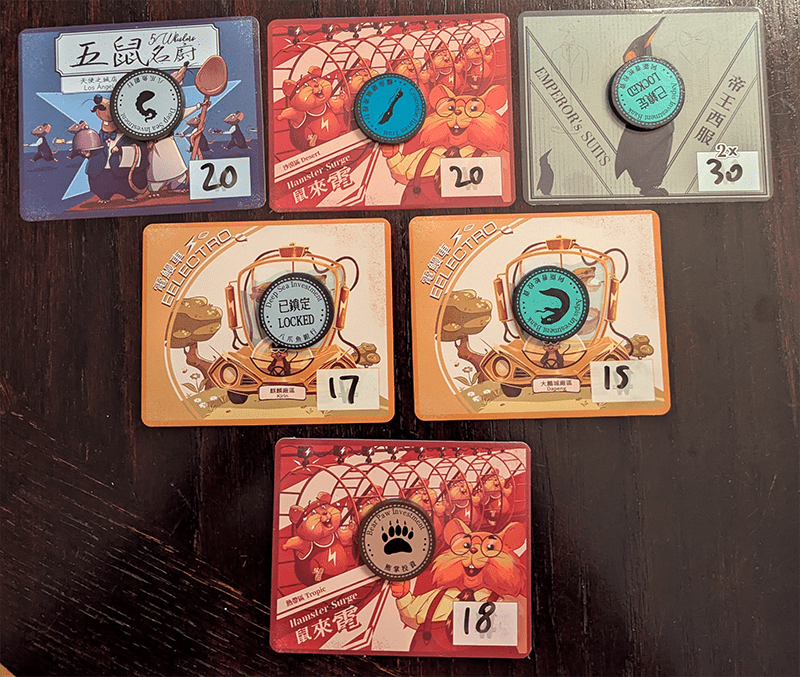 What’s intriguing about this system is the varying risk levels of the four stocks. Not only are the income payouts different for each stock, but the dice rolls also move them differently. For instance, the low-risk blue stock only moves 1 or 2 spaces, while the high-risk red stock can move 3 or even 7 spaces! These markers stay in place for the next round, which can make future negotiations for the same stock a bit more complex.