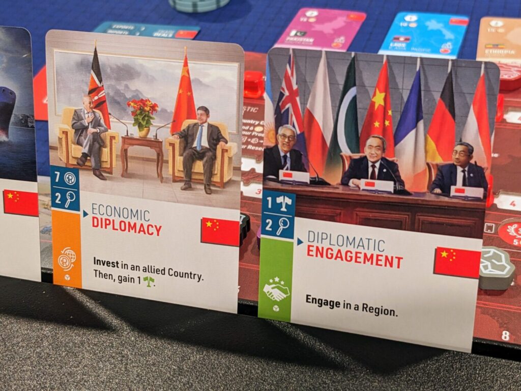 Players begin the game with 12 cards, most of which feature basic versions of the game’s eight main actions, from Trade (the main way to earn cash) to Improve Relations (adding more allied countries to a player’s tableau, offering them chances to build military bases in friendly countries, using allies to discount other actions in the same region, and other goodies) to the Move action, which grants a player chances to move their military units around the globe to impose the threat of military action, mainly to force opponents to match strength or potentially lose end-of-round points.