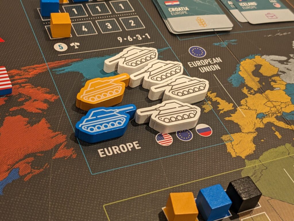 The year is 2010. Players, taking on the roles of one of the period’s four major superpowers (USA, China, the European Union, and Russia, known as the Russian Federation here) will take turns across six rounds to build a pool of allied countries, impose the threat of military conflict across the game’s seven regions, invest in favored allies and engage in diplomatic relations, all in search of the almighty victory point, points that will be both gained and lost throughout the game.