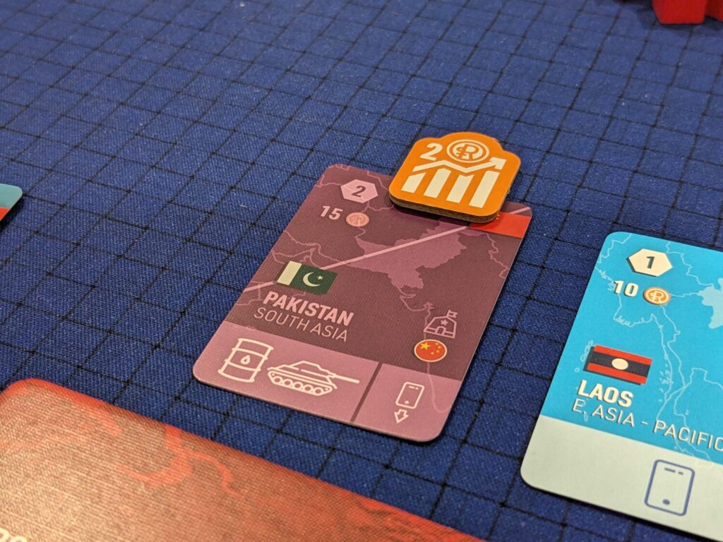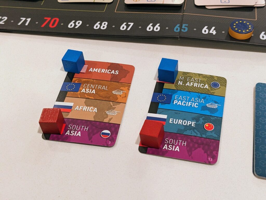 One minor callout, which may or may not be a criticism: the four factions play essentially the same way. However, during scoring rounds, the USA has an “ability” that requires them to be tied or have strict area control in at least four of the board’s seven regions. I found that to be quite challenging during my single play as the USA, and I wasn’t even being specifically targeted for area majorities during that game. If the USA has control of fewer than four regions, they take a penalty in victory points. China and the Russian Federation have unique scoring conditions that grant them points instead of penalties, and China’s condition only triggers at the end of the game, not during both scoring rounds like the US does.