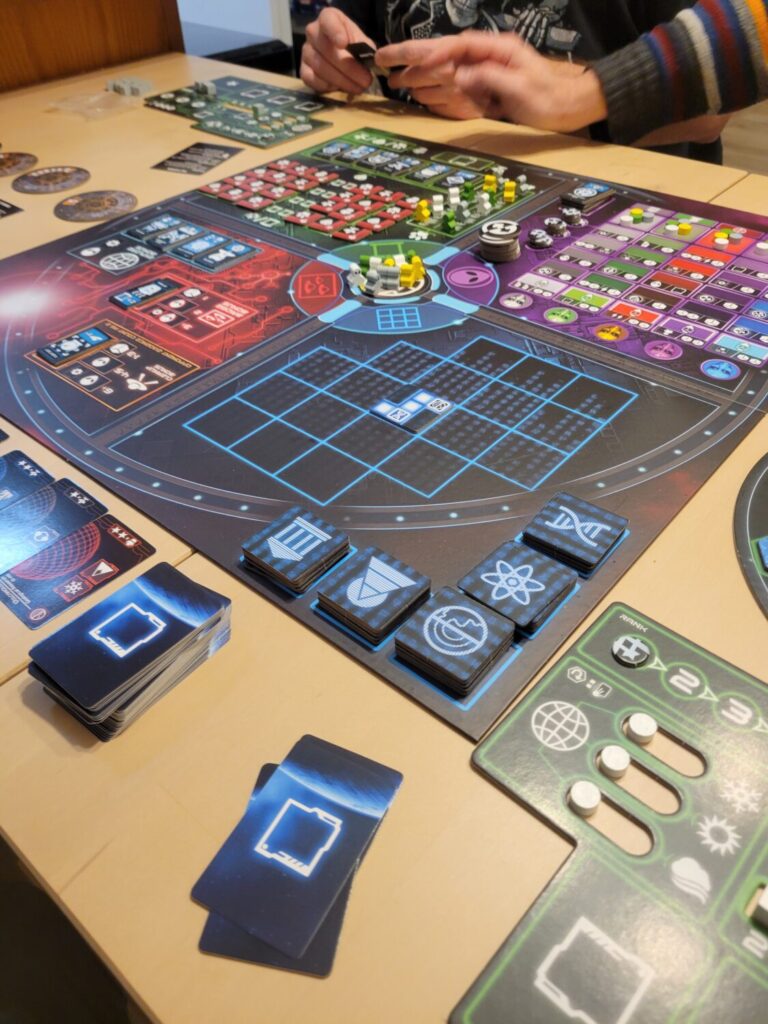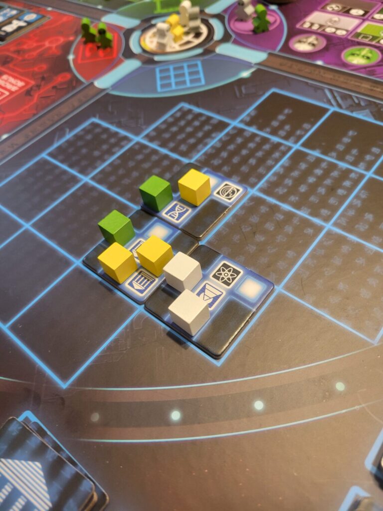 Mission control has players either exploring the planet (flipping tiles) or pulling their aliens back from the hex map. When aliens leave Earth, they leave behind negative points on the board and cover matching icons on their contracts. Those covered contracts are then used at the final action location, moving the cubes from the cards to a grid that vaguely resembles a DNA sequence. Each cube on the grid is two points at the end of the game.