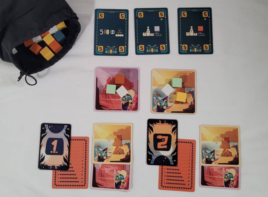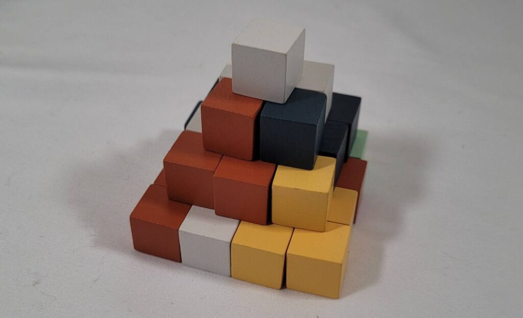 The game comes to an end after ten rounds. At this point, unless you’ve had to discard a cube or two, you’ll have a completed pyramid with a 4×4 base. When scoring, you’ll consider your pyramid from an overhead view. Only the visible cubes will count toward any of the scoring criteria.