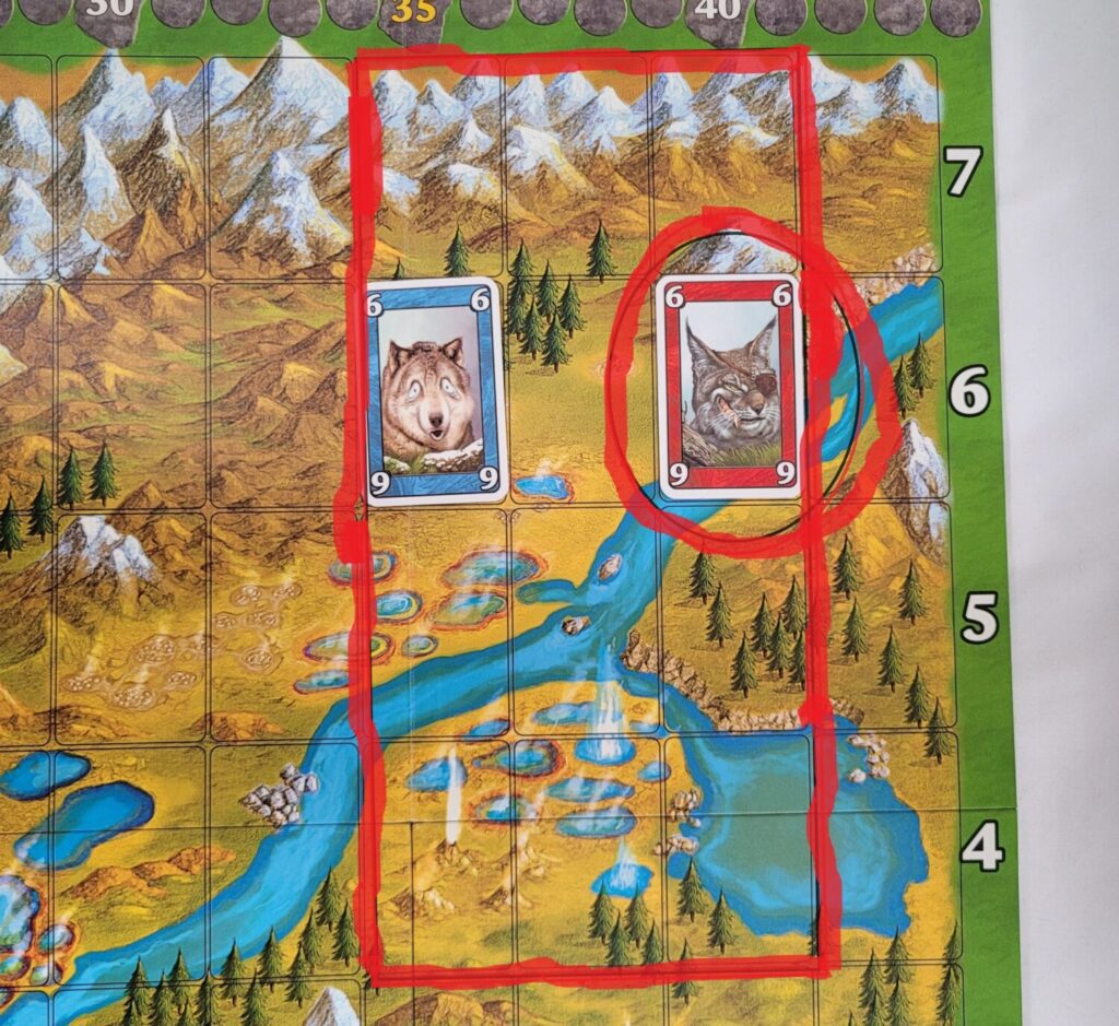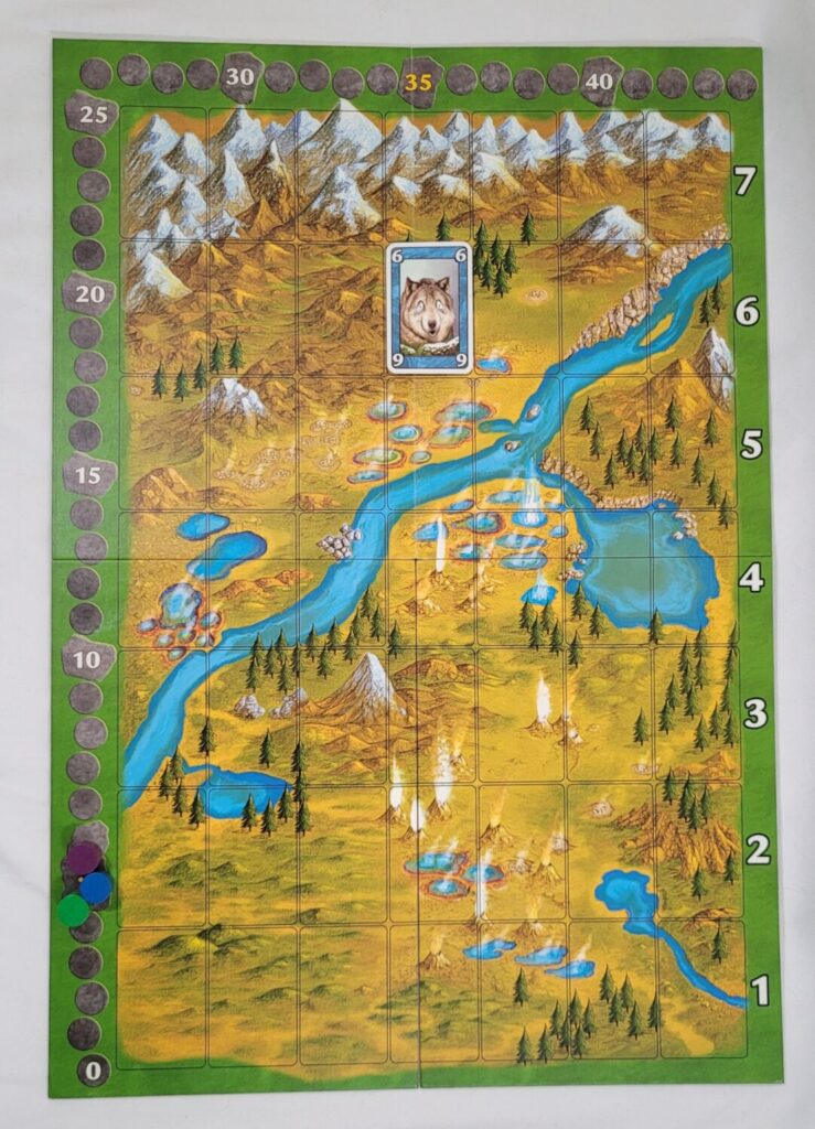 Yellowstone Park is played on a 7×7 grid laid on top of an illustrated overhead view of the titular park. The rows are numbered from 1 to 7 in ascending order, starting from the lowest row and moving upwards. There is a score track running along the left side of the grid. Each player’s score marker begins at the number 5 spot on this track.