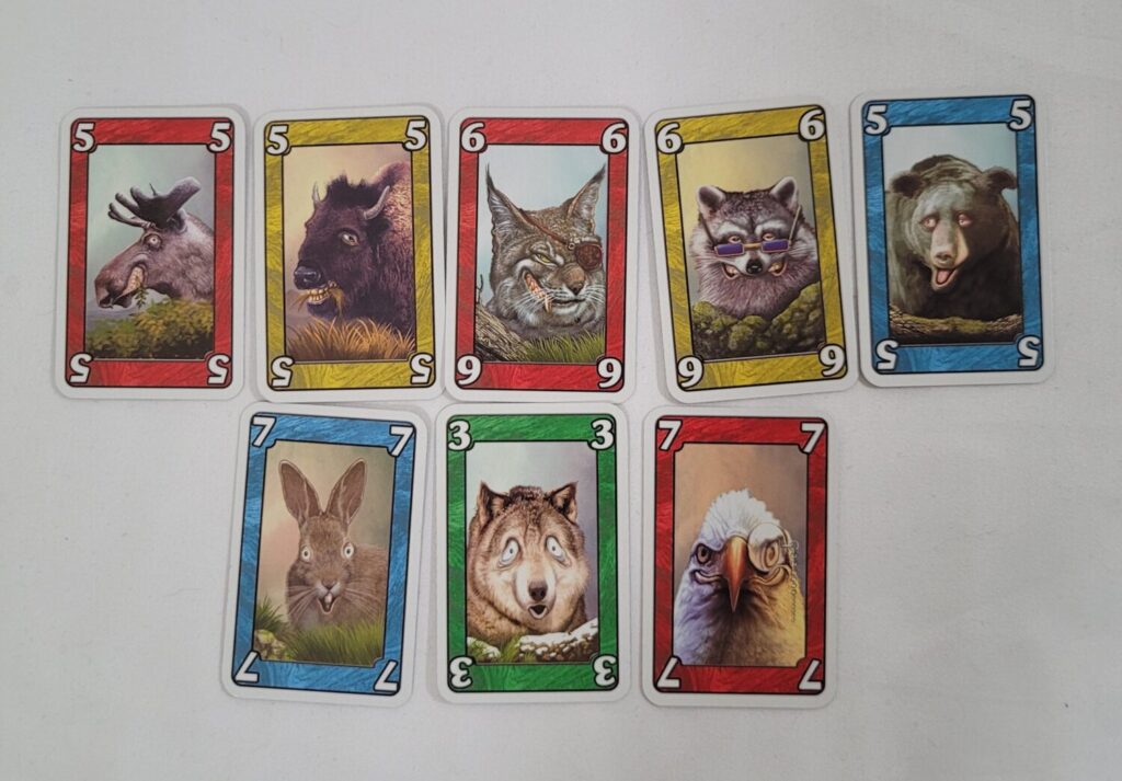 There is also a deck of 56 Animal cards. Each card is one of four colors (red, green, yellow, blue) and one of seven numbers (1 through 7). For each number, there are two copies of that number + color pair (two copies of green 1, for instance). Every card features a cartoonish image of an animal, but these illustrations are unimportant for the purposes of the gameplay.