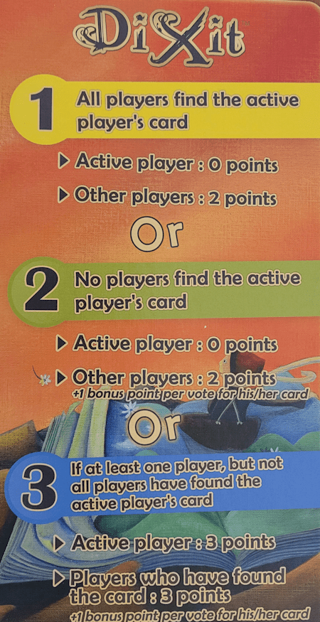 Coming up with and giving that clue is a deliciously tense moment for the active player. They need to give a clue that is vague enough that at least one player will not be able to figure out which of the cards is theirs, but clear enough that at least one player will be able to figure it out. All this is because of the gorgeous scoring system: